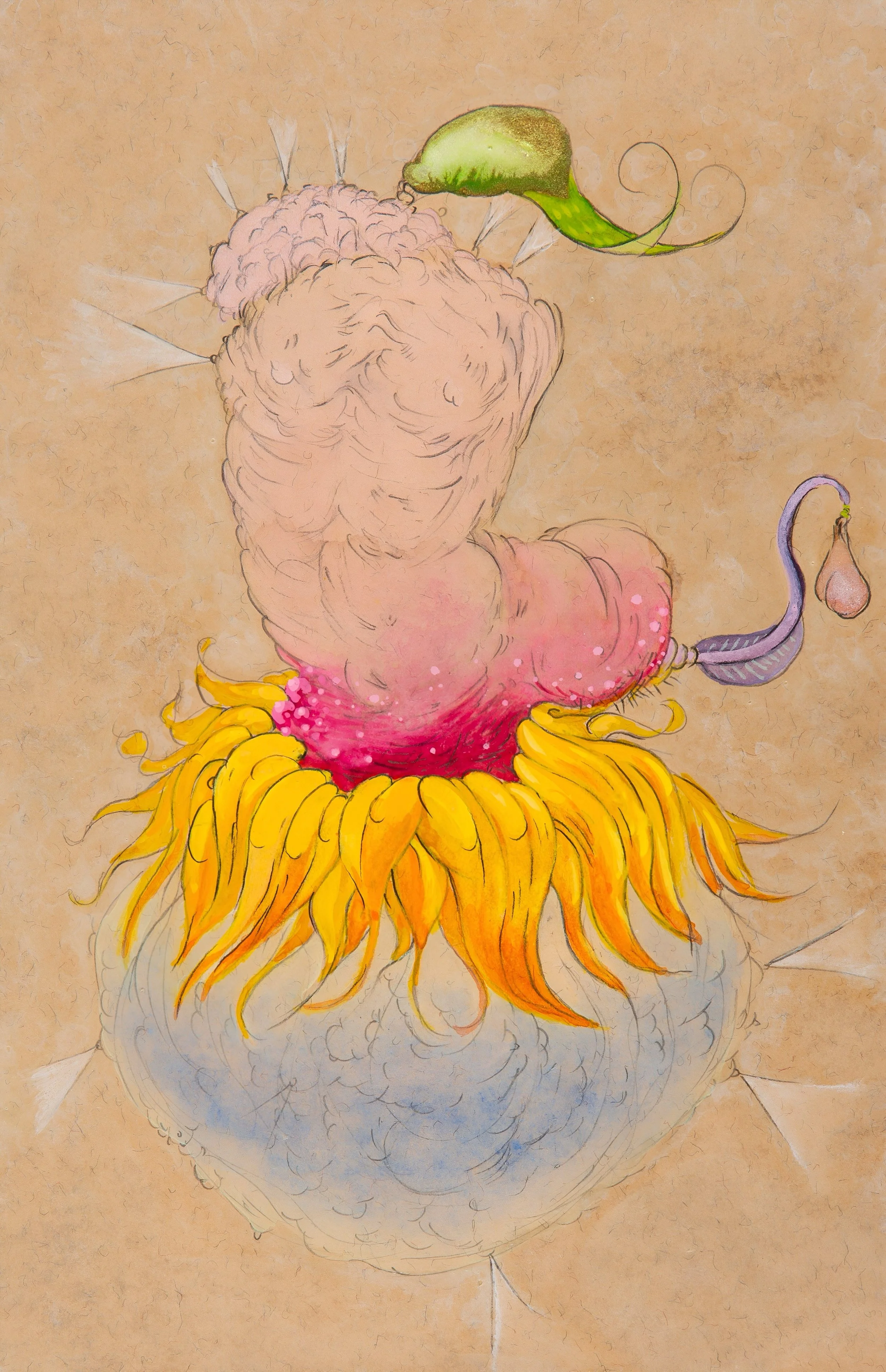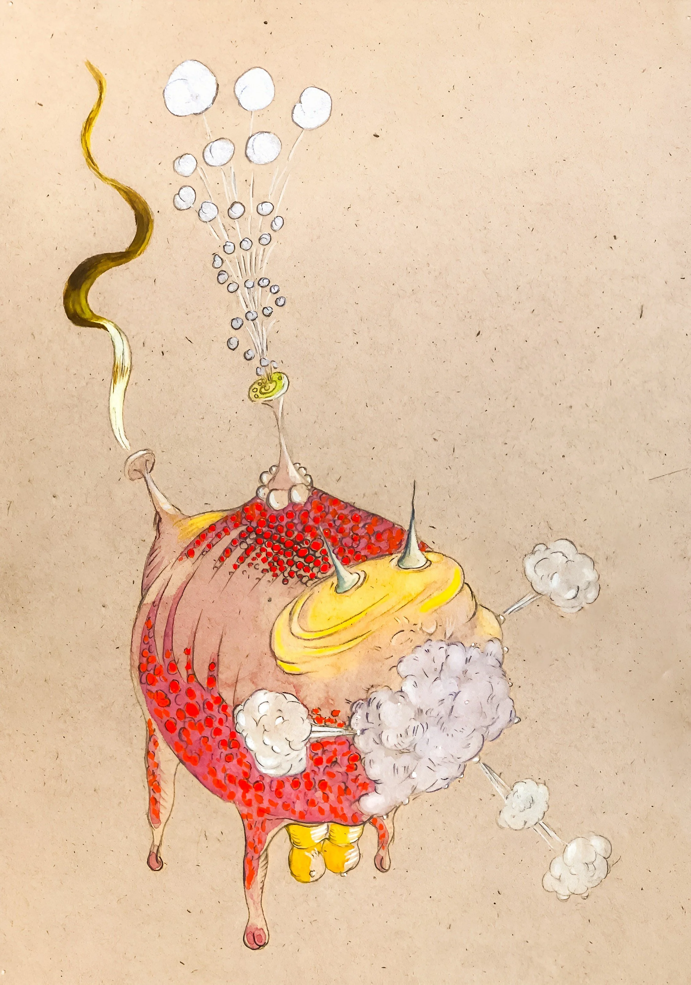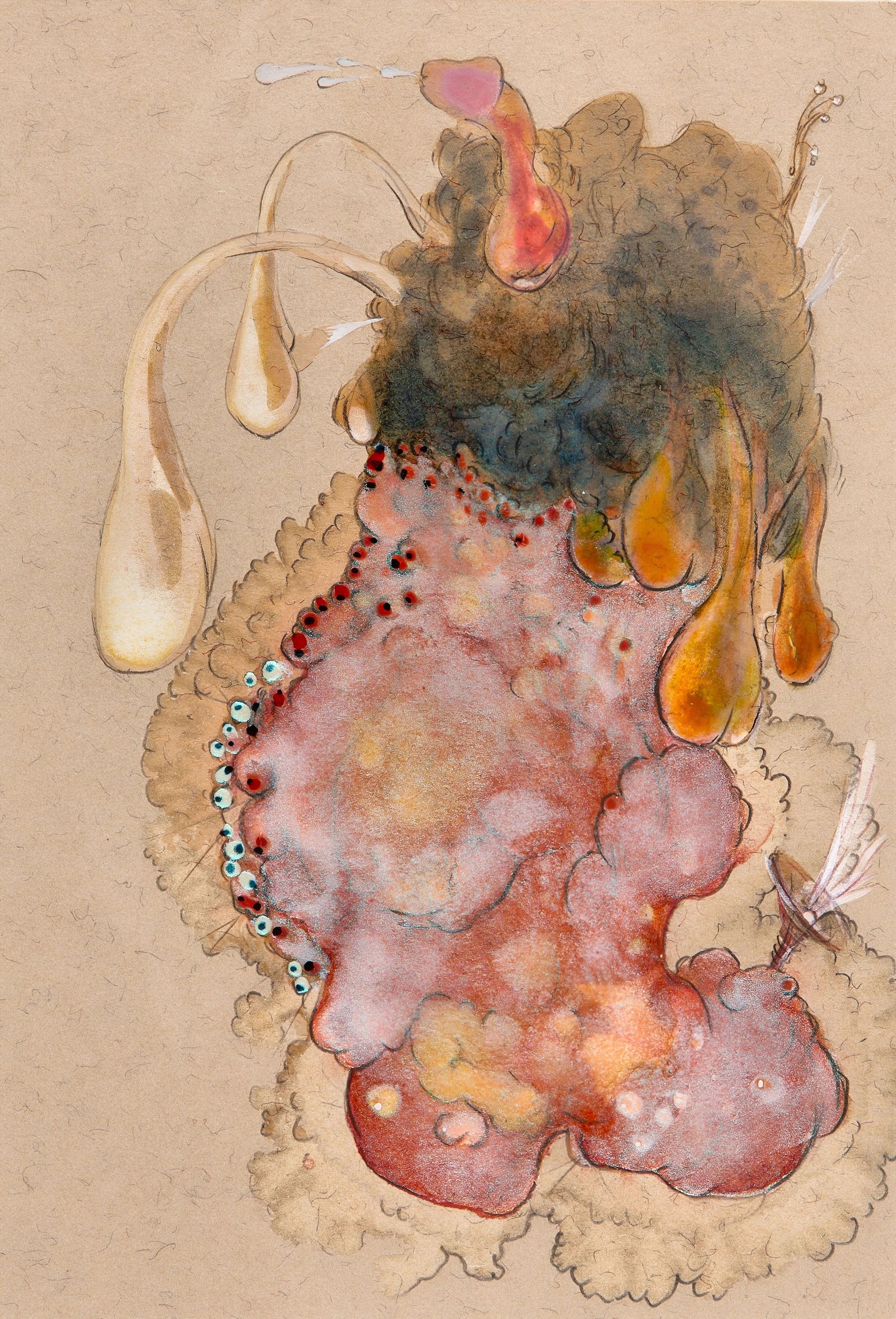 ingens purpura cerebri cum parva rubicunda pila sacci, watercolor with Kremer pigments on recycled paper