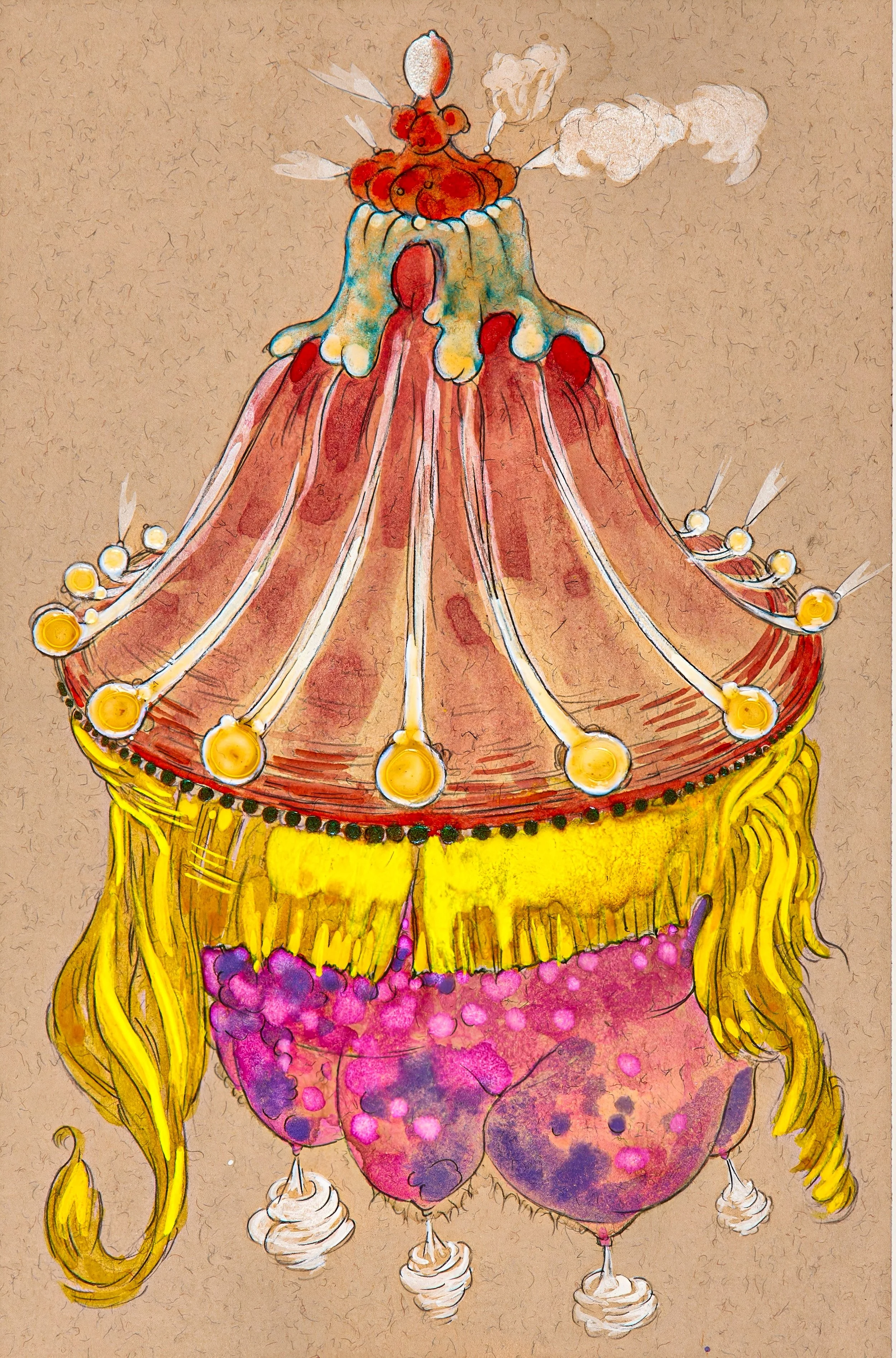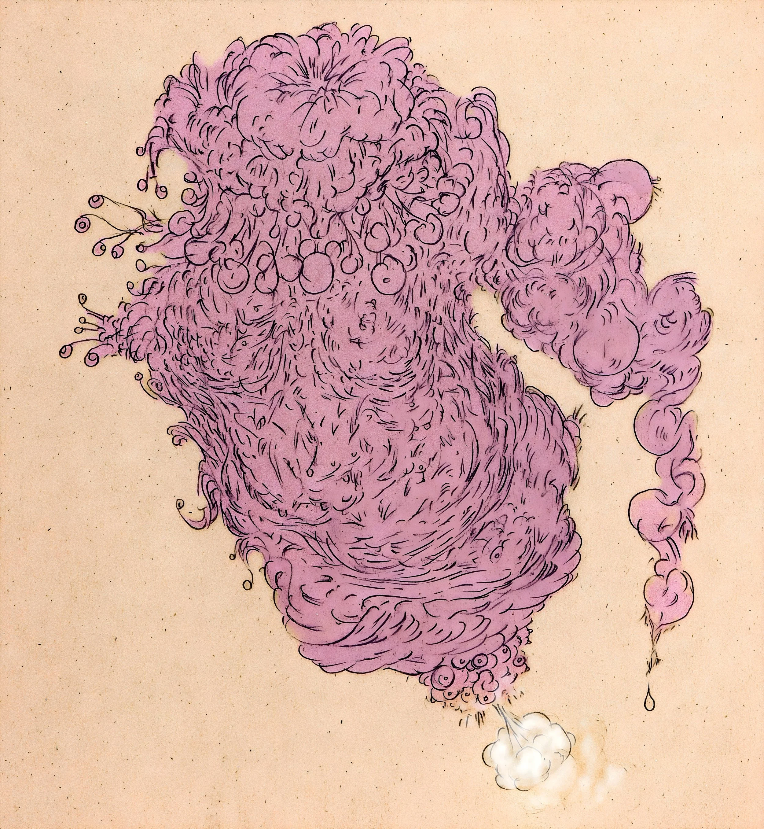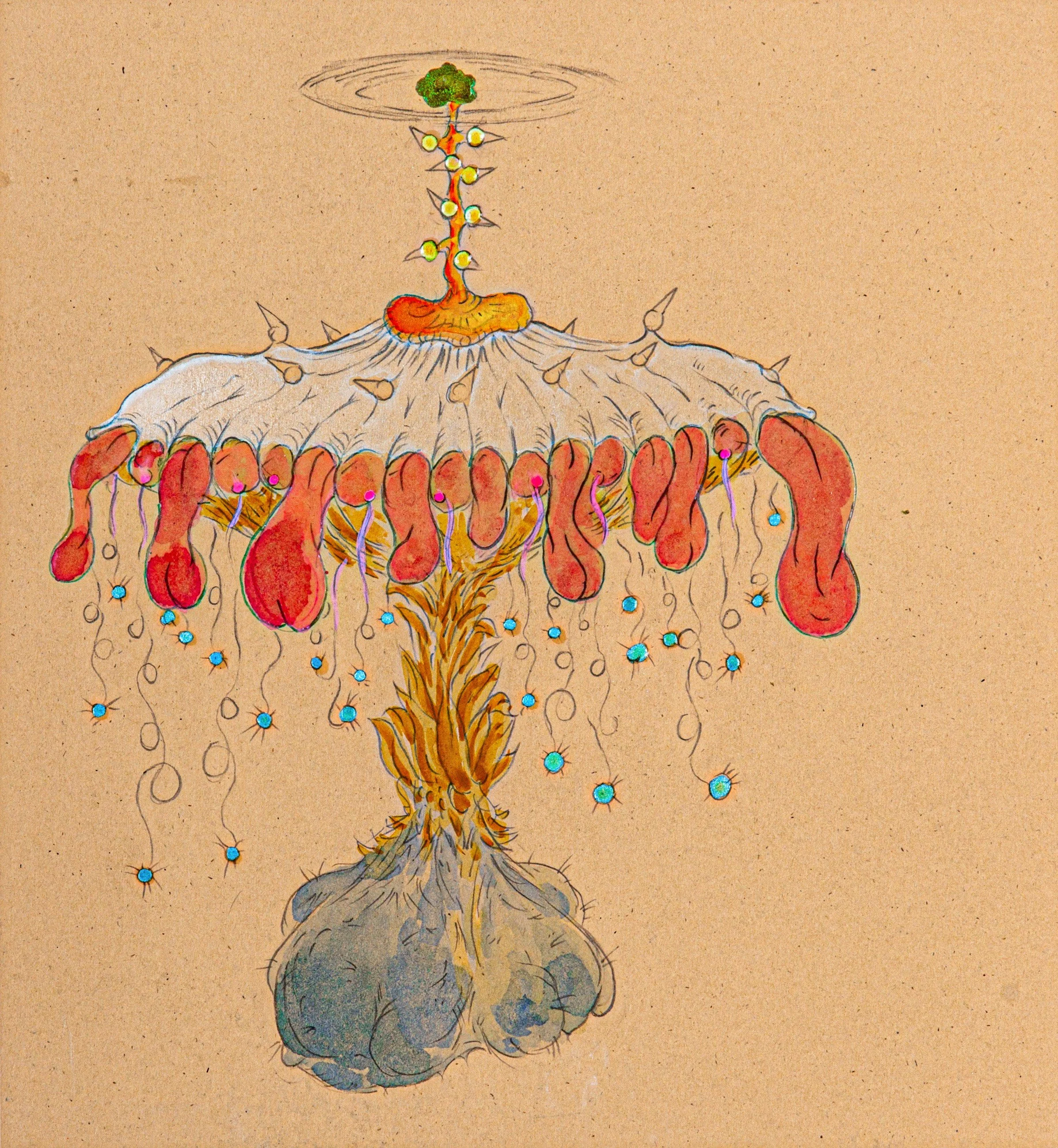 ingens purpura cerebri cum parva rubicunda pila sacci, watercolor with Kremer pigments on recycled paper