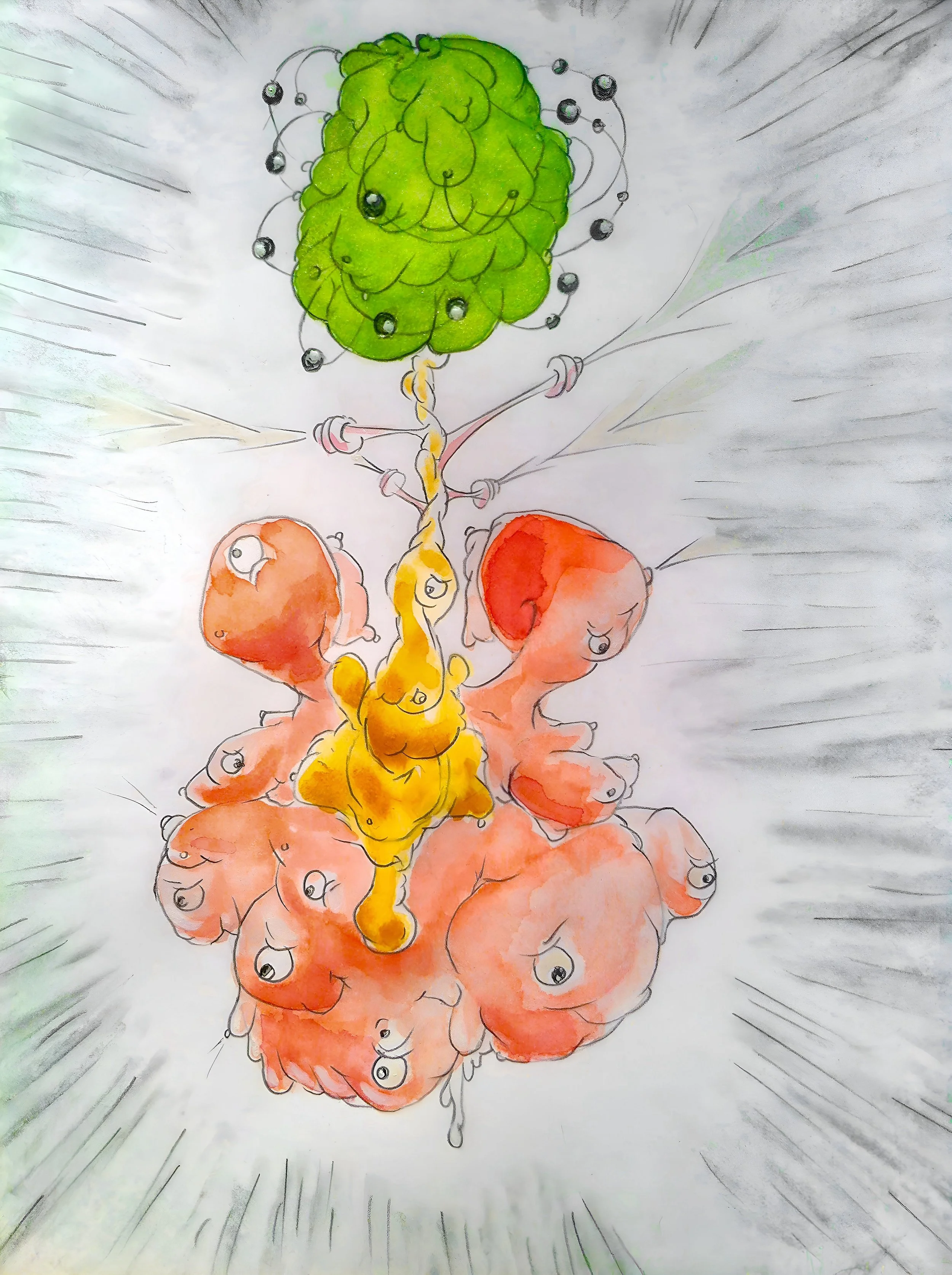 Atomic Brain Gang, watercolor with Kremer pigments on recycled paper